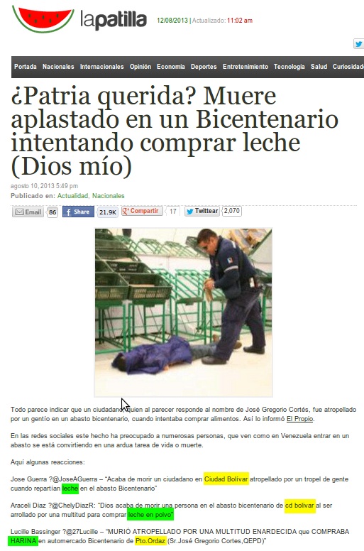 generan una falsa idea de la realidad.El director de la red de Abastos Bicentenario adelantó que pronto publicarán un comunicado en referencia a este caso a través de la dirección electrónica: http://www.abastosbicentenario.gob.ve/. Hasta el momento, El Propio y La Patilla mantienen colgadas ambas noticias; El Propio publicó un desmentido, pero La Patilla no.